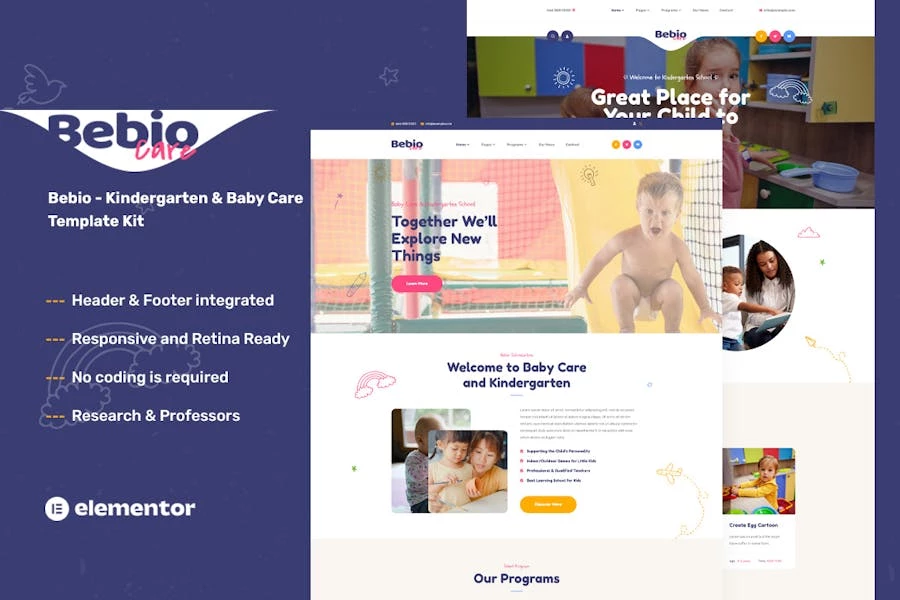 Especificaciones: Bebio – Template Kit Elementor para jardines de infantes y cuidado de bebés