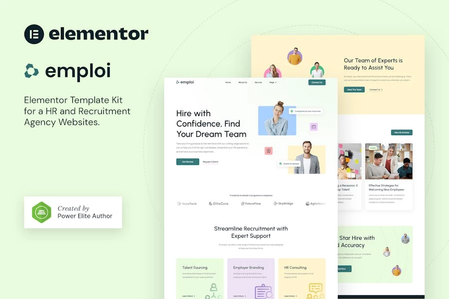 Emploi es un Template Kit Elementor moderno y limpio que es perfecto para aquellos que desean crear un sitio web de aspecto profesional para Recursos Humanos, Empresas de reclutamiento, subcontratación, asesores de recursos humanos y gerentes de reclutamiento. Esto el kit tiene un diseño hermoso y único con un diseño 100% responsivo, retina- listo y muy fácil de personalizar porque al usar Elementor no necesitas un ¡una sola línea de codificación!