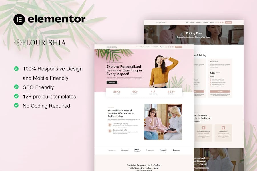 Especificaciones: Flourishia – Kit de plantillas Elementor Pro para coaching empresarial femenino