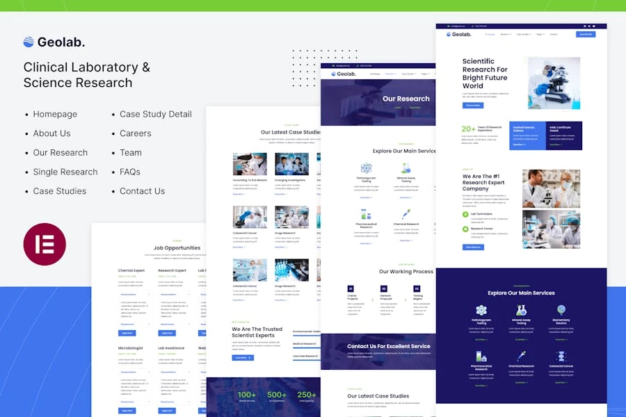 Geolab | Template Kit Elementor de laboratorio clínico e investigación científica