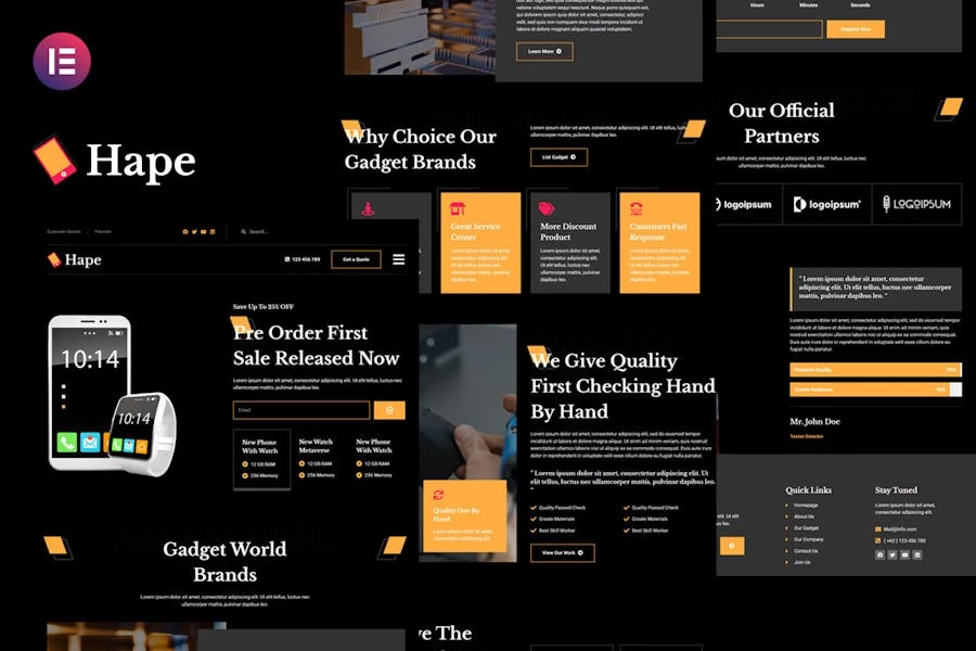 Hape – Gadget Showcase Elementor Pro Template Kit es una Colleción de diseños para el Plugin de WordPress del creador de páginas Elementor, diseñado para usar con la versión Elementor Pro para un diseño limpio. Funciona con la mayoría de los temas y está optimizado para su uso con el tema gratuito Hello Elementor.