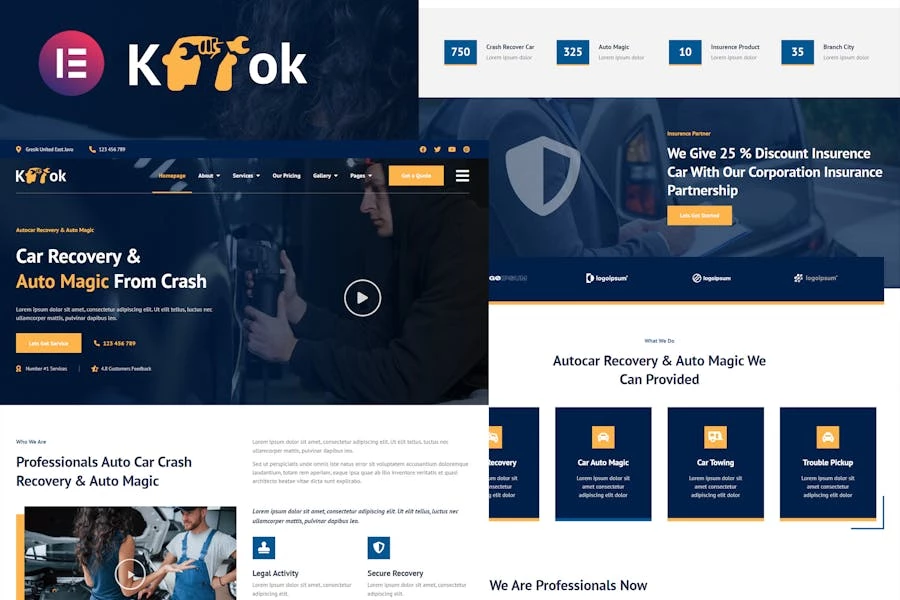 Template Kit Elementor de Ketok – Autocar Recovery & Auto Magic es una Colleción de diseños para el Plugin de WordPress del creador de páginas Elementor, diseñado para usarse con la versión Elementor Pro para lograr un diseño limpio. Funciona con la mayoría de los temas y está optimizado para su uso con el tema gratuito Hello Elementor