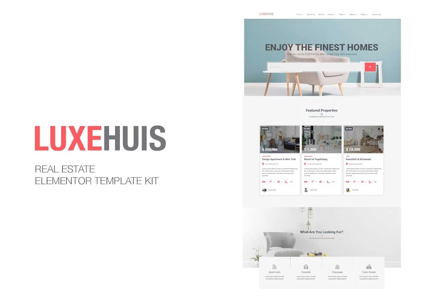 Luxehuis: es un kit de plantillas de Elementor con todas las funciones creado especialmente para el sitio web inmobiliario. Esta plantilla tiene un diseño hermoso y único con un diseño 100% responsivo, listo para la pantalla retina y fácil de personalizar