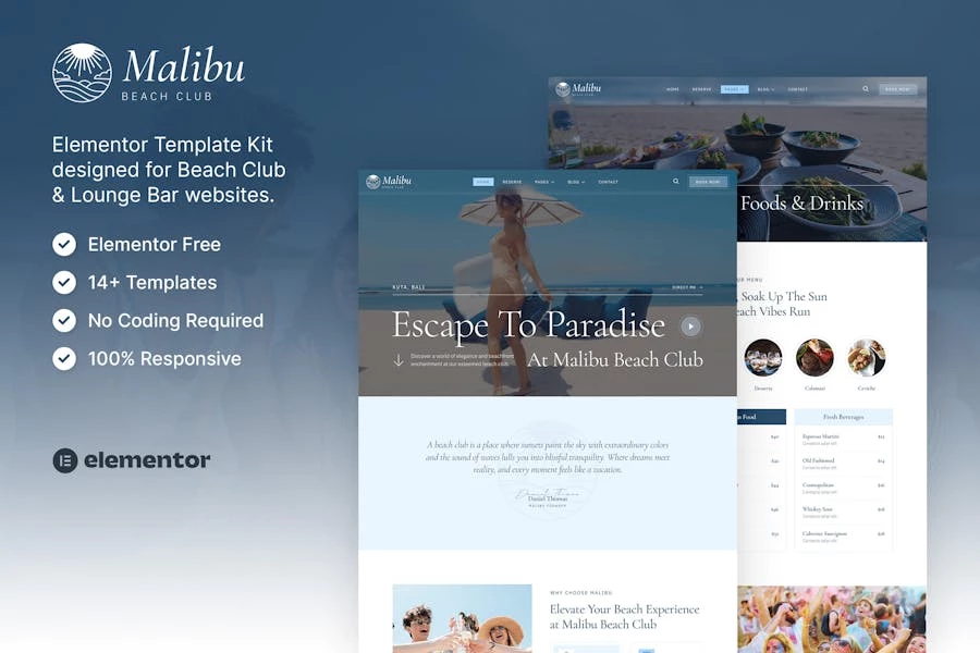 Especificaciones: Malibú — Kit de plantillas Elementor para club de playa y bar lounge