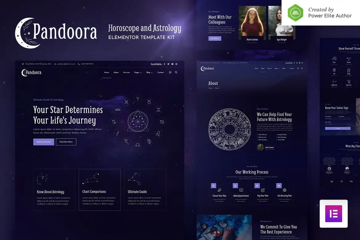 Especificaciones: Pandoora — Kit de plantillas Elementor de horóscopo y astrología