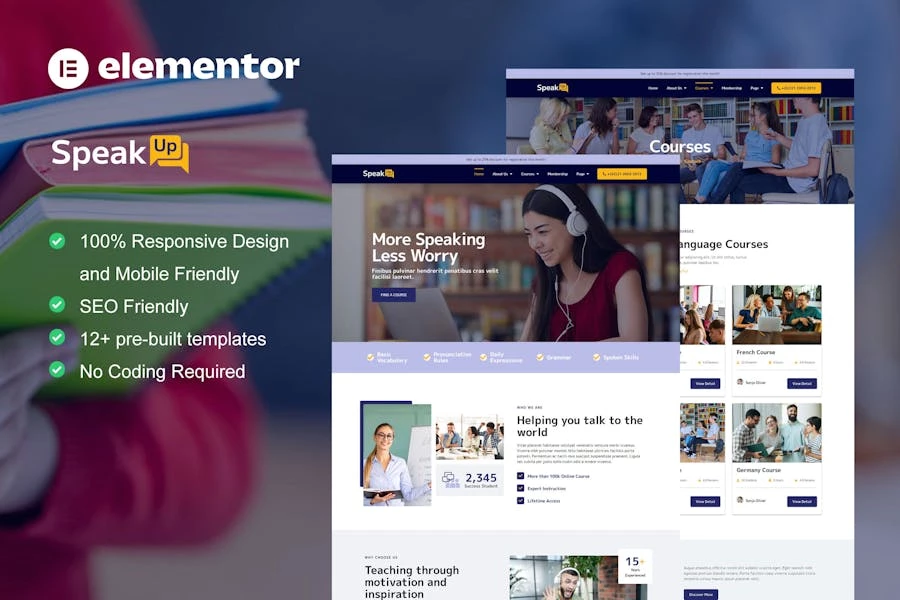 SpeakUp es un template kit elementor para el sitio web de cursos de idiomas y servicios de traducción Tiene 12 plantillas prediseñadas con un diseño moderno y un estilo profesional. Puede iniciar y crear fácilmente su sitio web para negocios de cursos de idiomas y cualquier servicio creativo relacionado con el idioma con este template kit de elementor.