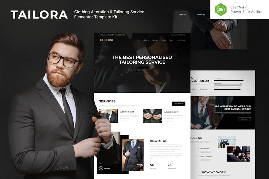 Tailora es un kit de plantillas Elementor moderno y limpio diseñado para crear un sitio web de nivel profesional, especialmente para servicios de confección y modificación de ropa, Además, se adapta perfectamente a la moda moderna y gentil, hecha a mano a medida Trajes a medida, servicios de reparación y restauración de ropa y cualquier otro de negocios relacionados con la moda.
