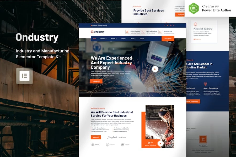 Ondustry es un Template Kit Elementor moderno y único que puede utilizar para crear un sitio web para la industria, la fabricación, la mecánica, la ingeniería, la maquinaria o cualquier otro negocio relacionado.