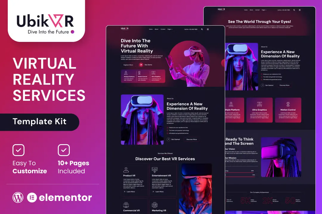 UbikVR es un kit de plantillas de Elementor diseñado para proveedores de servicios de realidad virtual. Con diseños elegantes y modernos, combina a la perfección imágenes envolventes y diseños intuitivos para mostrar tus productos, servicios y experiencias de realidad virtual. Ya seas un desarrollador de realidad virtual, un estudio o una startup tecnológica, UbikVR ofrece páginas personalizables que destacan tu innovación, atraen a tu audiencia y elevan la presencia digital de tu marca. Perfectamente optimizado para el rendimiento y la capacidad de respuesta móvil, este kit de plantillas facilita la creación de un sitio web impresionante y profesional.