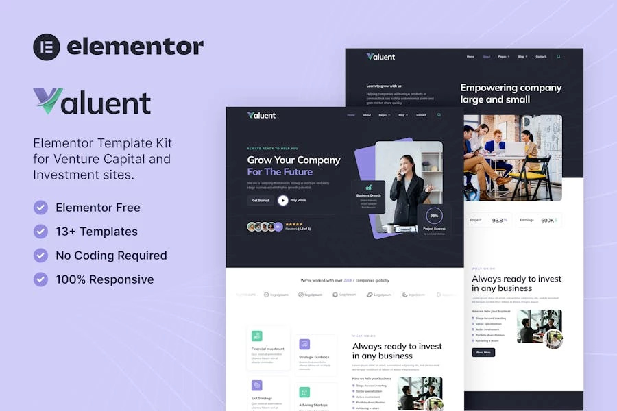 Especificaciones: Valuent — Template Kit Elementor para capital de riesgo e inversión
